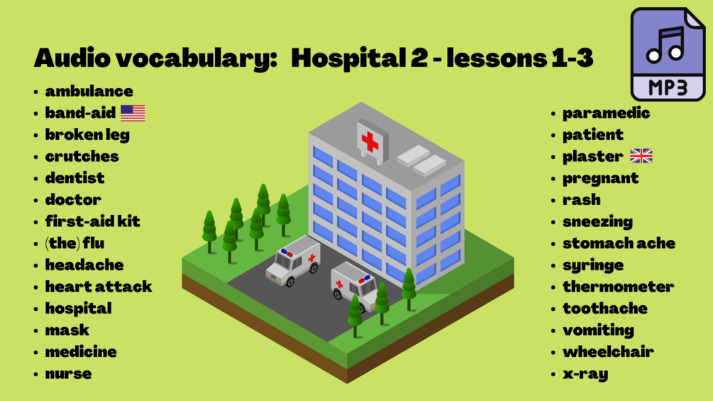 vocabulary: ambulance, band-aid, broken leg, crutches, dentist, doctor, first-aid kit, (the) flu, headache, heart attack, hospital, mask, medicine, nurse, paramedic, patient, plaster, pregnant, rash, sneezing, stomach ache, syringe, thermometer, toothache, vomiting, wheelchair, x-ray